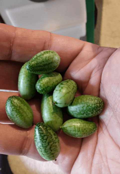 "Beit alpha" is the name of this tiny but productive cucumber grown in a pot year-round. These fruits only came once a year, for us but when they did, we enjoyed them like candy.